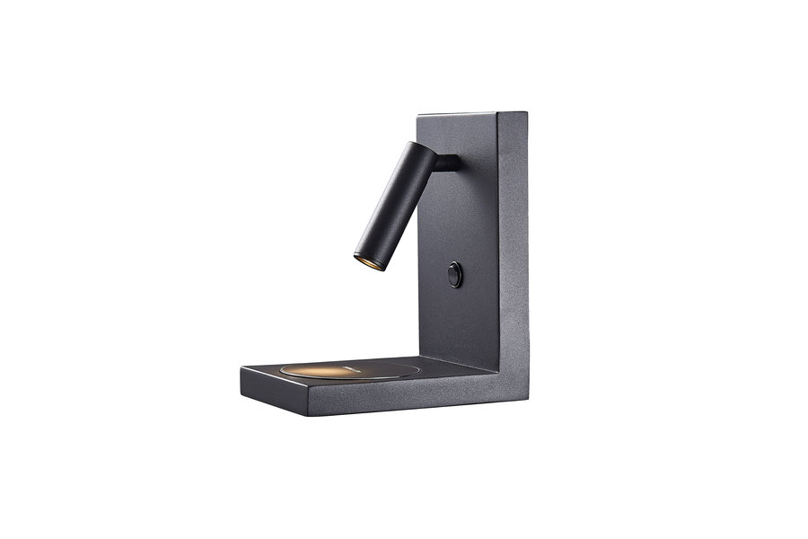 Moderne Wandleuchte mit verstellbarer Leselampe. Integrierter USB-Type-A-Anschluss zum Laden von Smartphones und Zubehör. Praktisch und stilvoll: integrierte Ablage für Geräte oder persönliche Dinge. Premium-Lösung für Hotels und gehobene Innenräume.
