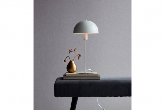 Table lamp with a rounded design inspired by retro style. Available in 5 trendy finishes: green, black, white, beige, and powder green. Provides pleasant light to create a warm atmosphere. Ideal for hotel rooms, lounges, and elegant residences.