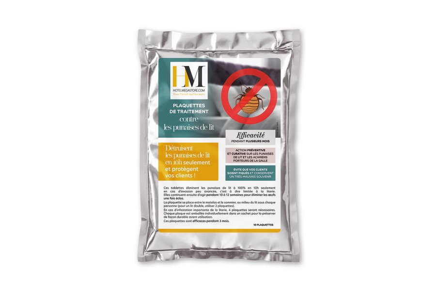 Bedbugs are the bane of hoteliers. Transported according to movements (in a suitcase, for example) a single bed bug ready to lay can trigger the plague in your establishment. Rest assured, HOTEL MEGASTORE offers preventive and curative... Bedbugs are the bane of hoteliers. Transported according to movements (in a suitcase, for example) a single bed bug ready to lay can trigger the plague in your establishment. Rest assured, HOTEL MEGASTORE offers preventive and curative bed bug treatments to get rid of them as quickly as possible. Our experts have selected for you the most effective and best suited products for the hotel industry: anti-bedbug... Find out more Bedbugs are the bane of hoteliers. Transported according to movements (in a suitcase, for example) a single bed bug ready to lay can trigger the plague in your establishment. Rest assured, HOTEL MEGASTORE offers preventive and curative bed bug treatments to get rid of them as quickly as possible. Our experts have selected for you the most effective and best suited products for the hotel industry: anti-bedbug pads and airtight anti-bedbug mattress covers. _x000D_ These solutions against bedbugs act in case significant infestation but also in prevention. Effective in 10 hours flat, the bed bug plates eliminate bed bugs and mites carrying scabies from your bedding. The bedbug pads stay active for 10 to 12 weeks and protect your customers from bites. _x000D_ The 80 x 115 mm pad is positioned between the mattress and the box spring in the middle of the bed, under each person. For intensive treatment, you can have 4 pads at the shoulders and knees of each person for a double bed. Our brochures comply with the Biocide Directive for repellents and insecticides. Bedbug covers protect a hotel's most precious asset: its bedding. Find out less